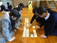 午後には第47回かるた会が行われました。どの班も授業内で学習した百人一首の成果を発揮し、一枚でも多くの札を取ろうと頑張りました。思い通りに札を取ることができた時には歓声もあがるなど、盛り上がりを見せました。結果は以下の通りです。