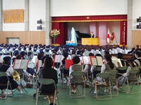 カトリック教会では、5月は聖母月(マリア様の月・お母様の月)としています。聖母マリアの在り方は、私たちの生き方の模範として、さらに父なる神に取り次いでくれる助け主として崇敬されてきました。今日は、マリア様の在り方から、私たちが目指す女性像を再確認して、またいつも優しく見守ってくださる、お母様に感謝をして5月31日「 マリア祭」を行いました。また、学院の創立を祝う日として創立記念式を行いました。