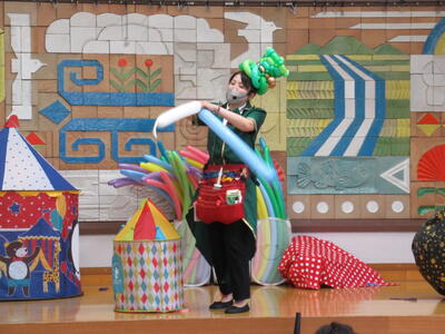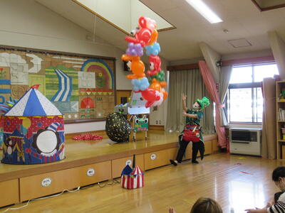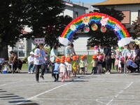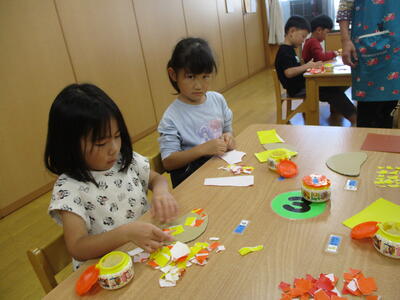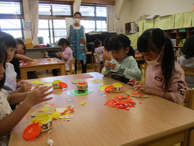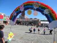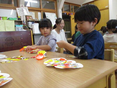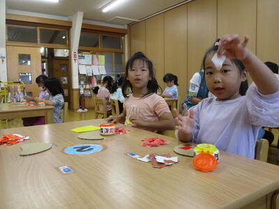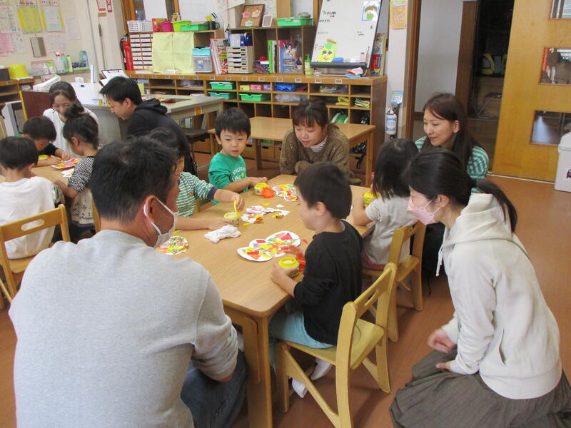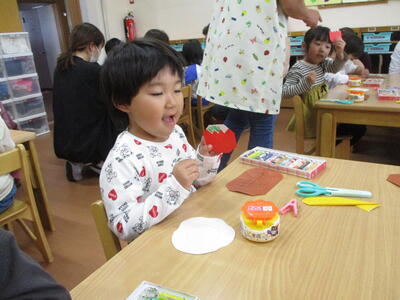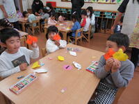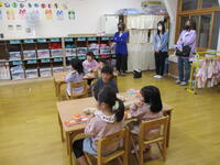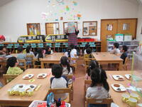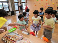たんぽぽ・ゆり・さくら組がお遊戯室で屋台給食を楽しみました