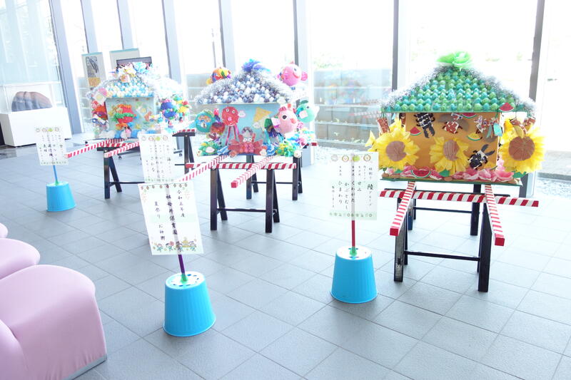 総合情報館に、たんぽぽ・ゆり・さくら組さんが作ったお神輿が展示してあります