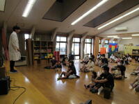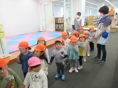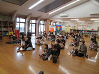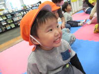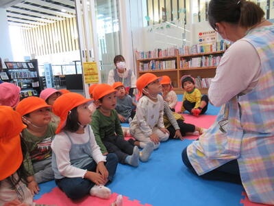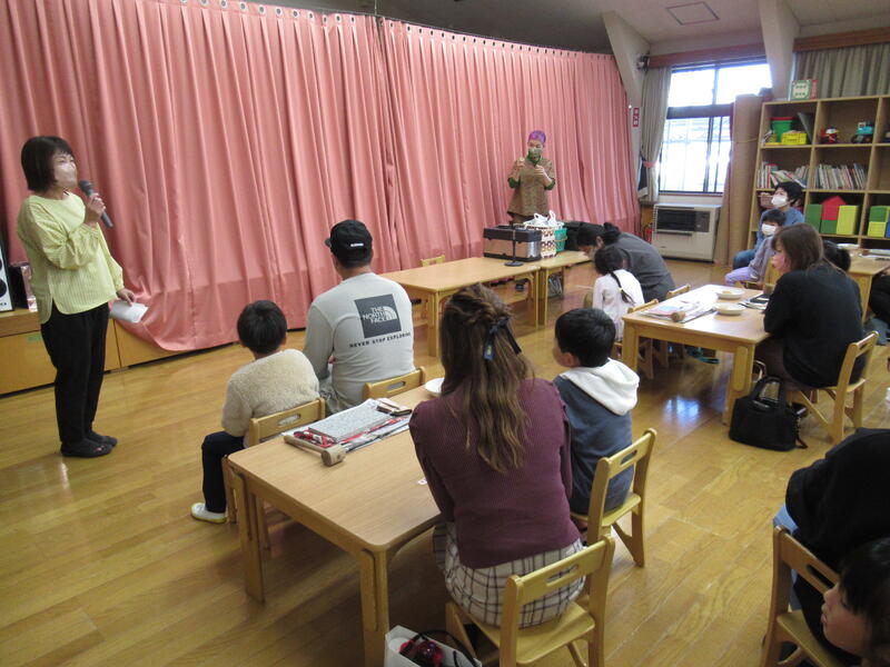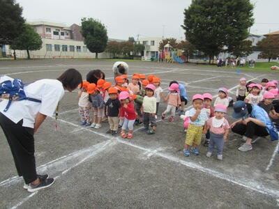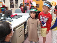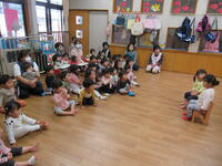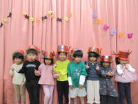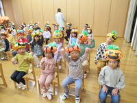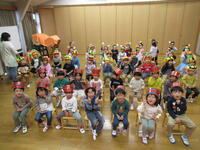 たんぽぽ・ゆり・さくら組さんはお遊戯室に集まってハロウィンのお話を聞きました。