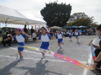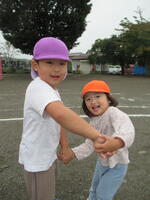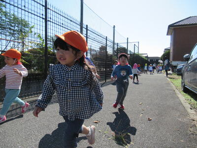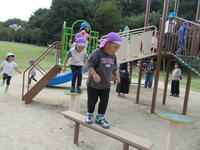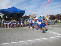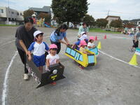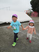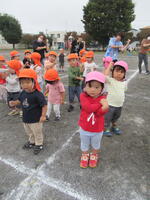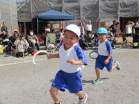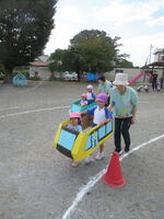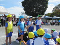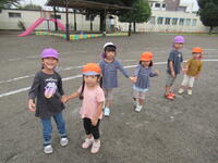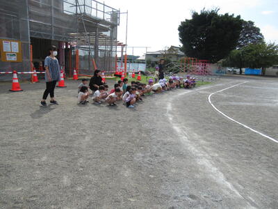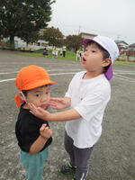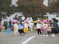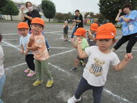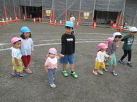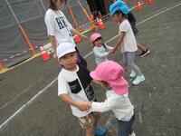 三角コーンタッチ競争コーチが倒してさくら組さんが起こします