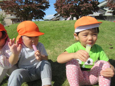 冷たい氷に大喜びの子どもたちおいしい~と満面の笑顔でした
