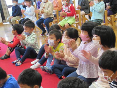 たんぽぽ組3歳児、ゆり組4歳児、さくら組5歳児が集まり、5名のお友だちをお祝いしました