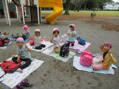 自分達で取ったさつまいもと一緒に「ハイッ!ポーズ」