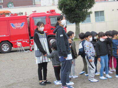 消防芳賀分署の方が来園し、避難訓練の様子を見てもらい、消火訓練や放水体験をさせていただきました。
