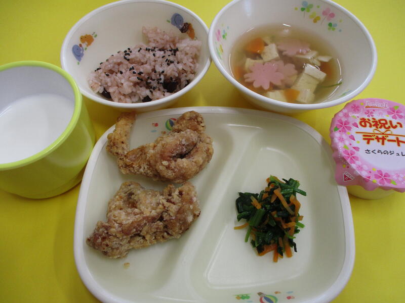 4月12日の給食 投稿日時 : 2024/04/12 祖母井保育園管理者 カテゴリ: ★赤飯 ★鶏肉のからあげ ★磯和え ★すまし汁 ★お祝いデザート {{options.likeCount}} {{options.likeCount}}
