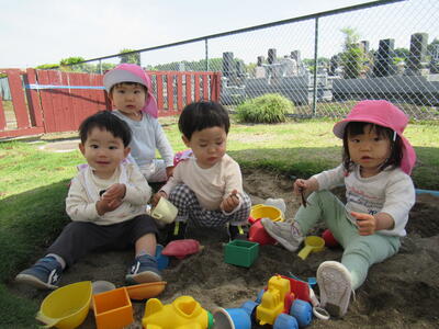 もも組は、テラスでつかまり立ちやハイハイしたり、