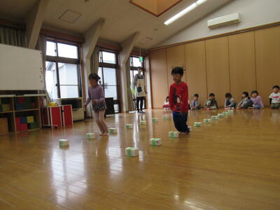 今日は、雨なので、遊戯室で「両足連続飛び越し」を行いました