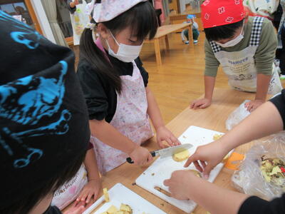 さつまいもは硬いので先生と一緒に