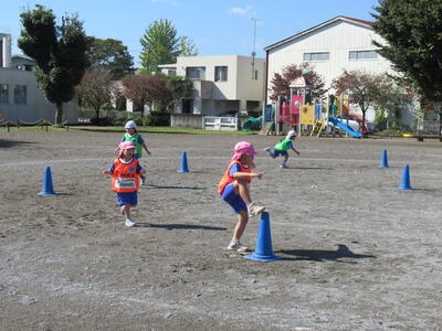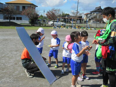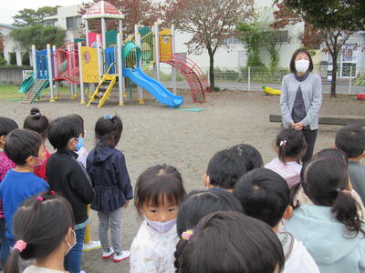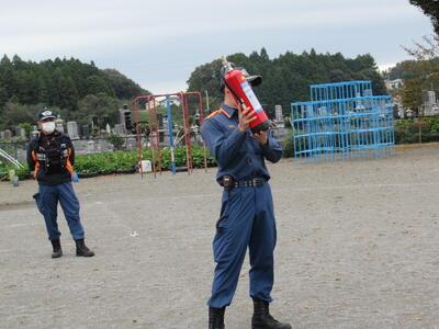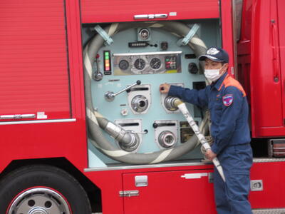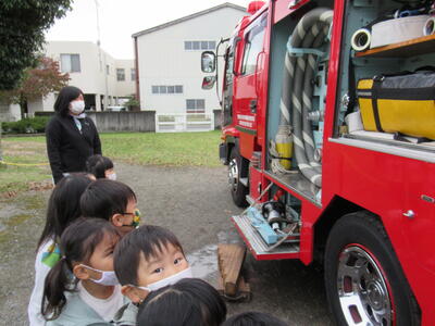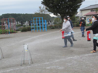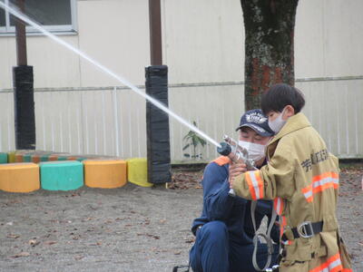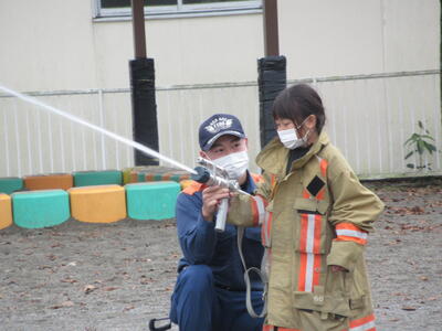 消防芳賀分署の方が来園し、避難訓練の様子を見てもらい、消火訓練や放水体験をさせていただきました。