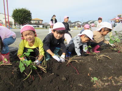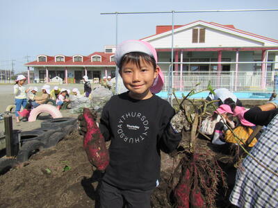 自分達で取ったさつまいもと一緒に「ハイッ!ポーズ」