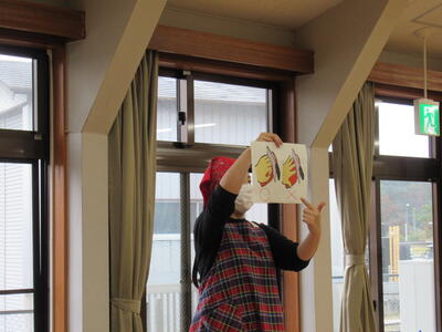 給食の前に、さくら組さんのお部屋で、栄養士の青山先生から絵本の読み聞かせや、お話がありました。