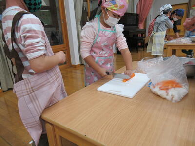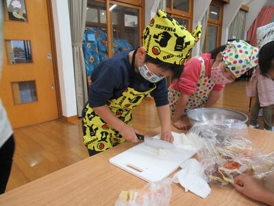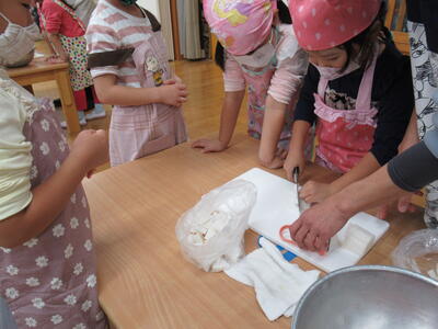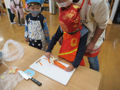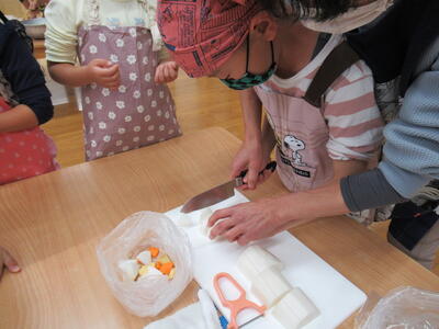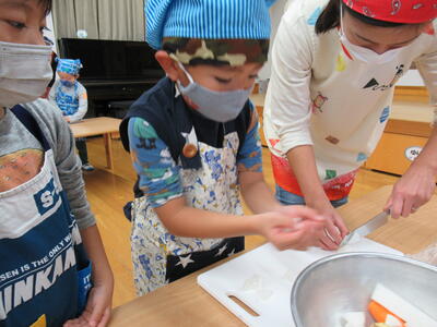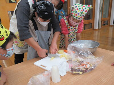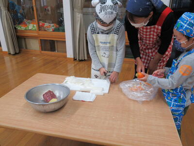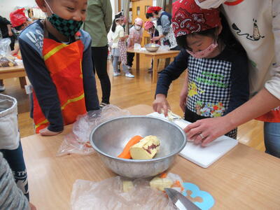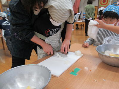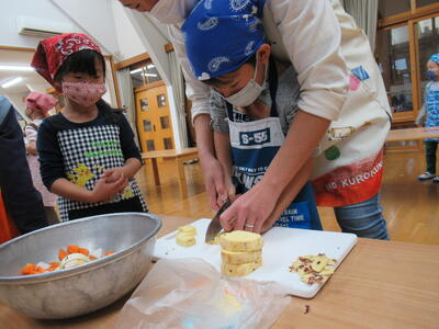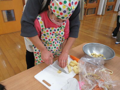 さつまいもは硬いので先生と一緒に
