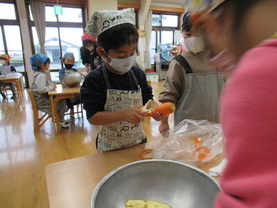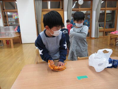 今日は、さくら組が保育園で穫れたさつまいもを使ってさつま汁を作ってくれる日です