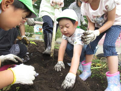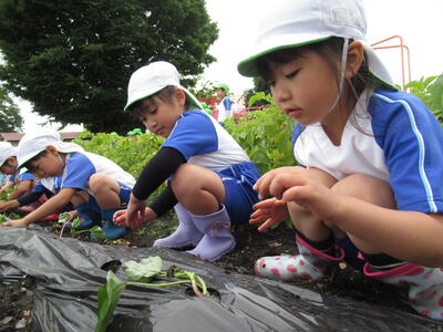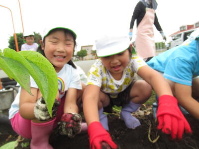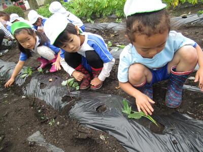 さくら組さんがさつまいもの苗を園の畑に植えました