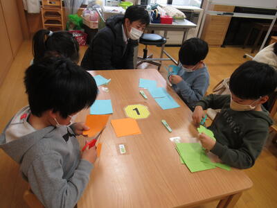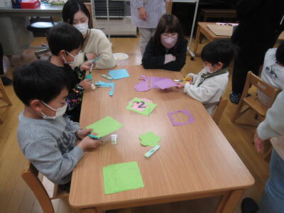 たんぽぽ組さんは、保護者の方と一緒に鬼のお面の製作です美術・図工