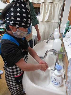 エプロン・バンダナ・マスクをして しっかり手を洗って消毒します