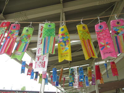 さくら組さんの作ったきれいなこいのぼりが飾られています