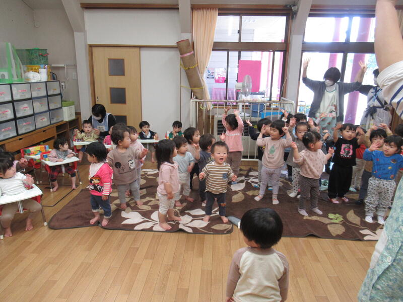 こどもの日のお祝いでミニ運動会をたんぽぽ・ゆり・さくら組が園庭で行いました