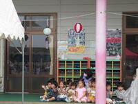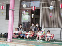 もも・つくし・すみれ組さんもテラスからお祭り気分を楽しみました