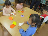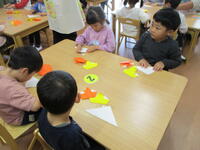 折り紙でコウモリを折ったり、かぼちゃの顔、三日月などをハサミで切りました