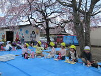 さくら組とゆり組で、園庭の桜の木の下にブルーシートを敷いて、お花見給食を食べました