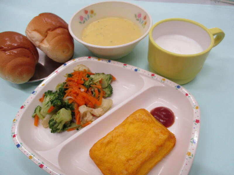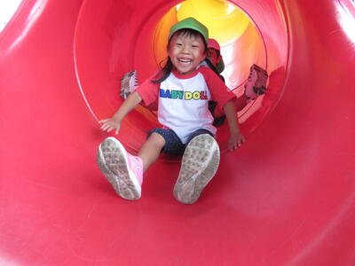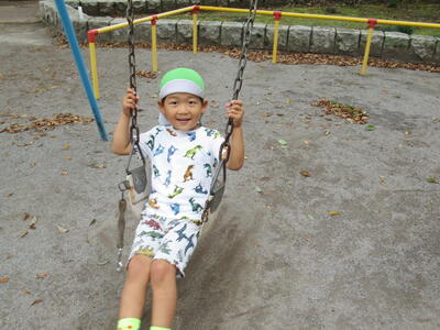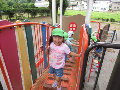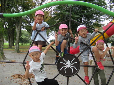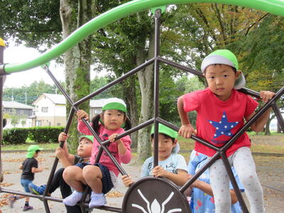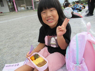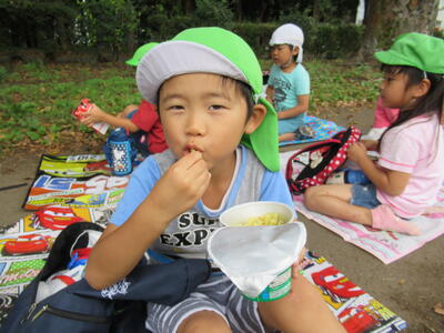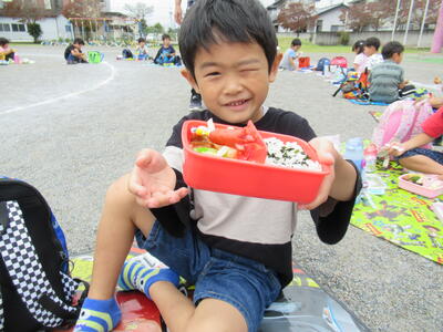 昨夜の雨で芝生が濡れていたので、手作りのお弁当は園に戻り園庭で食べました