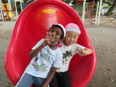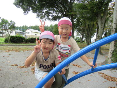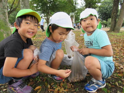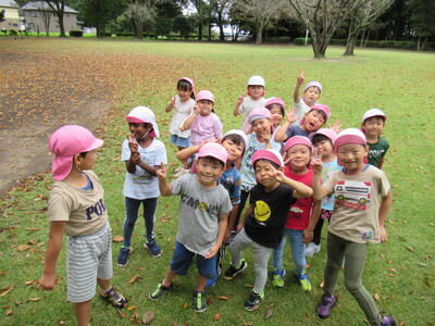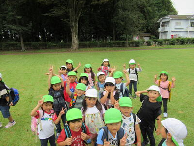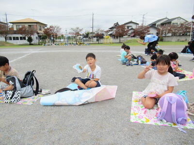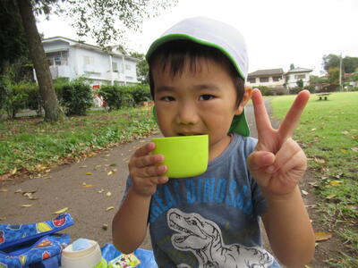 昨夜の雨で芝生が濡れていたので、手作りのお弁当は園に戻り園庭で食べました