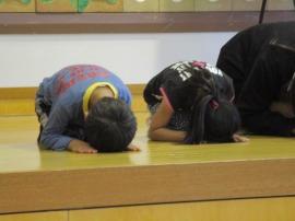 「石(いし)」になって、連れ去られる事を防ぐ練習をしたり、大きな声で助けを呼ぶ練習もしました。誘拐について学ぶことができ、皆また1つお利口になりましたね!