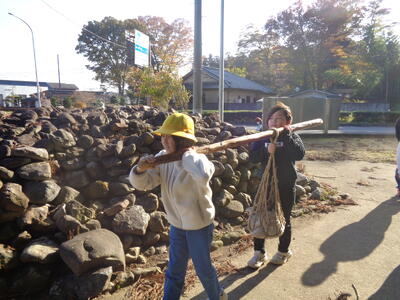 博物館の外で、先人たちの苦労を体験するために、「水汲み」「モッコ担ぎ」体験もしました。