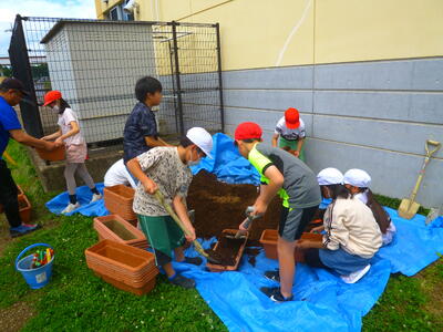 昼休みに環境委員会が明日のプランターへの花植えのための準備をしていました。