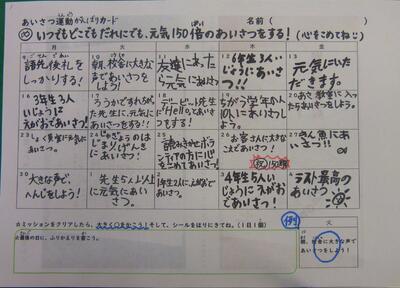 いつもアイディアいっぱいの児童会のみんなは今回創立150周年記念コラボ企画としてあいさつがんばりカードに毎日違うミッションがあります。がんばりカードのミッションがクリア出来たら昇降口のあいさつ運動特設コーナーに掲示してある150周年記念ペンリンピヨリンポスター(これも児童会が作成しました)にシールを貼ることができます。あいさつ運動中に完成できるといいですね。
