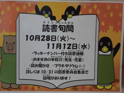 10月28日(月)~11月12日(水)の期間は、読書旬間でした。本校の課題でもある「進んで読書する児童」の育成をめざし、いろいろな取組をしてきました。