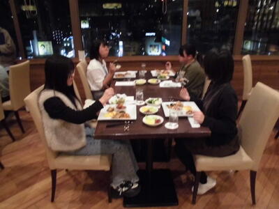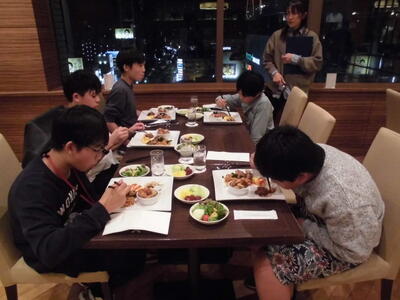 夕食の様子です。ご飯がおいしいと評判のホテルです。夕食は10階にある夜景の見えるレストランで、食事をしました。