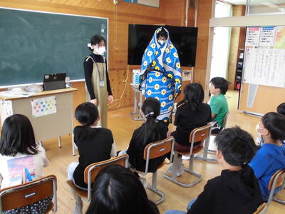 矢板市健康福祉部高齢対策課の方を外部講師にお招きし、5年生が高齢者疑似体験と認知症サポーター養成講座の授業を行いました。まず、高齢者疑似体験をしました。装具を付けて、動きにくさを体感し、どんな支援をしてもらうとうれしいか考えました。次に、認知症についての講話を聞き、理解を深めました。今日の学習を生かして、思いやりをもって共に生きられる社会をつくっていってほしいと思います。