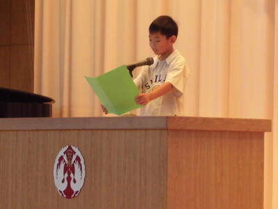 本日の朝の活動は、2・5年生による安唱タイムでした。5年生は国語の学習で学んだ古典より、竹取物語や平家物語等の音読をしました。2年生は、落語の代表的な「寿限無」等を暗唱し、発表しました。どちらの学年も、全校生の前で堂々と発表することができました。