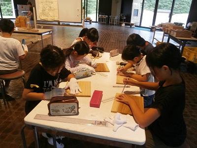 13日の午後の活動は、焼き板作りです。指導者の方の説明を聞いて活動に取りかかりました。安全に気をつけてのこぎりやバーナーなどの工具を使い、オリジナリティ溢れる焼き板を作ることができました。