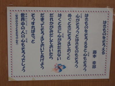 下記の資料は昇降口に掲示してあるものです。子どもたちは、この資料を毎日見ています。また、先生方もこの資料に書かれた意味をしっかりと子どもたちに伝えています。それを受け、子どもたちはくつをきちんとくつ箱に入れます。とても大切なことです。くつ箱のくつが揃っているのを見るのは、気持ちがいいものです。
