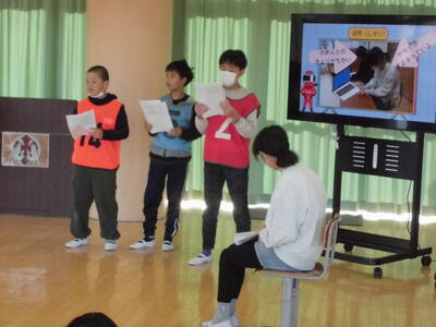 今日の朝の活動は、保健体育委員会主催の集会を行いました。本校で実施している「生活がんばりカード」や片岡地区小中一貫連携推進事業の一環として行っている「タイムマネジメントカード」の結果から、メディアの使い方が大きな課題となっています。今日の集会では、そのメディアについて発表をしました。健康でよりよい生活を送るためには、時間を決めてメディアと付き合うことが大切だということを学びました。