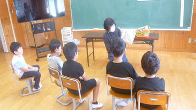 6年生は紙芝居で「きたかぜのくれたテーブルかけ」「びんぼうがみとふくのかみ」を読んでいただきました。