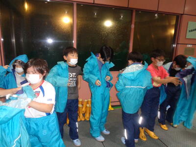 雨具に着替えて大雨体験です。