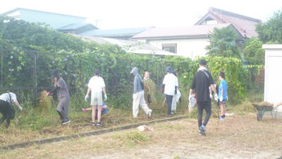 午前7時より、親子奉仕作業を行いました。10月25日(土)に開催する運動会の会場を整備するとともに、伸びた雑草の除草などを行いました。