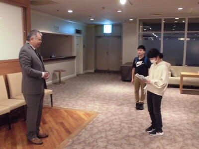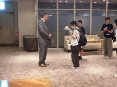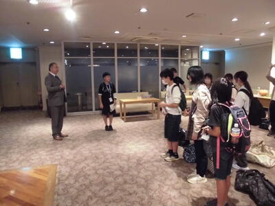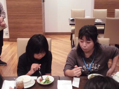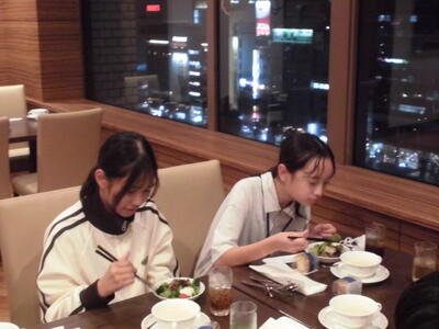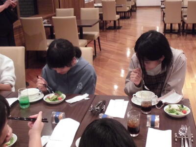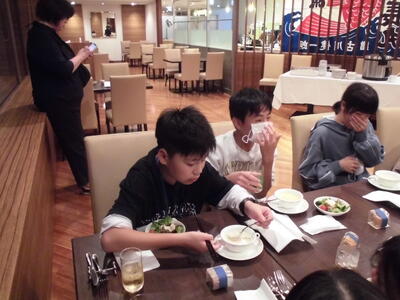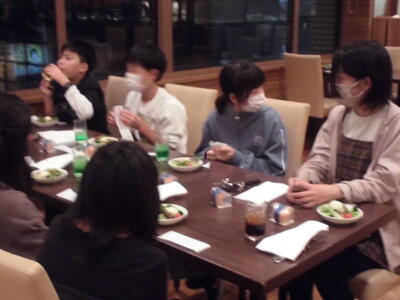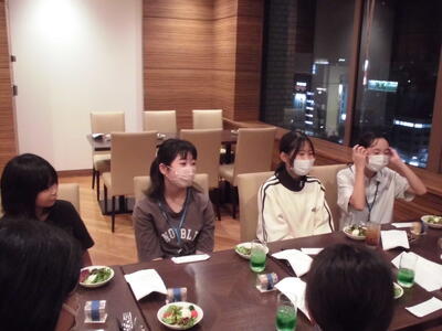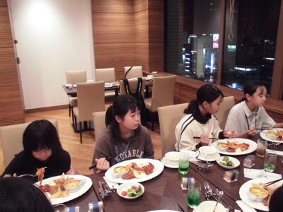 入館式と夕食の様子です。夕食は10階にある夜景の見えるレストランで、少し優雅に食事をしました。子どもたちは、大満足でした。(少し緊張もしていました。)明日の朝は、お楽しみのバイキングです。
