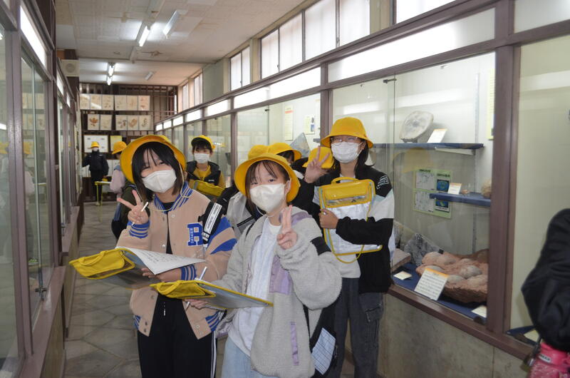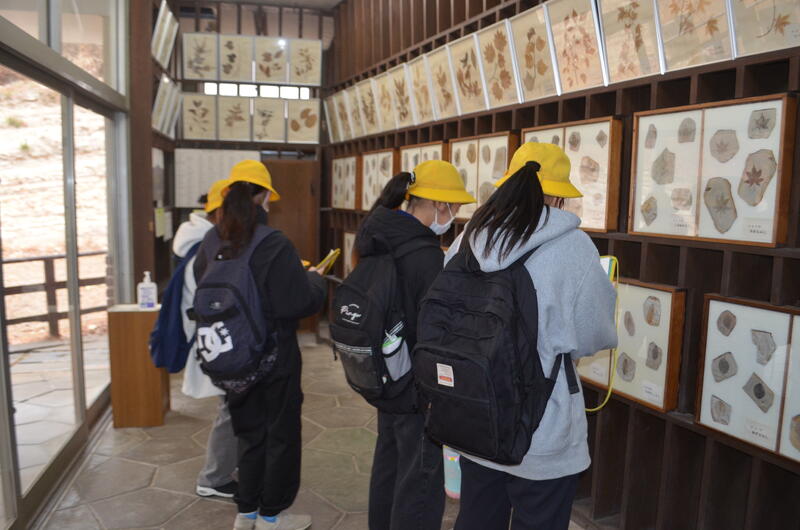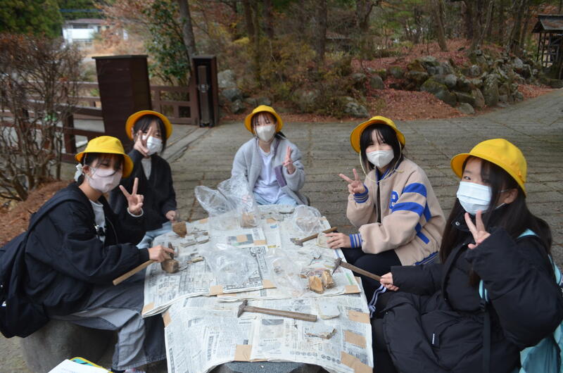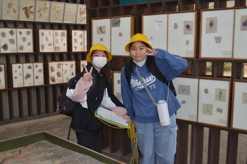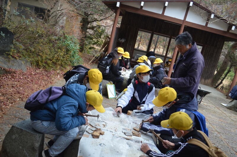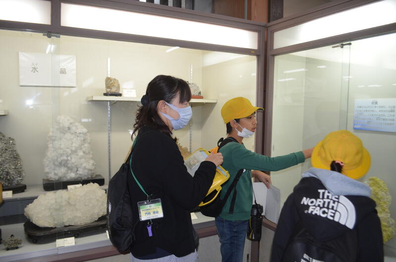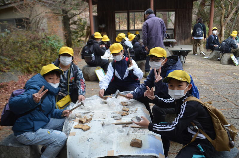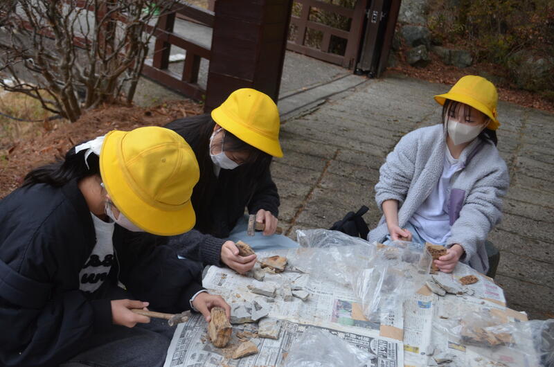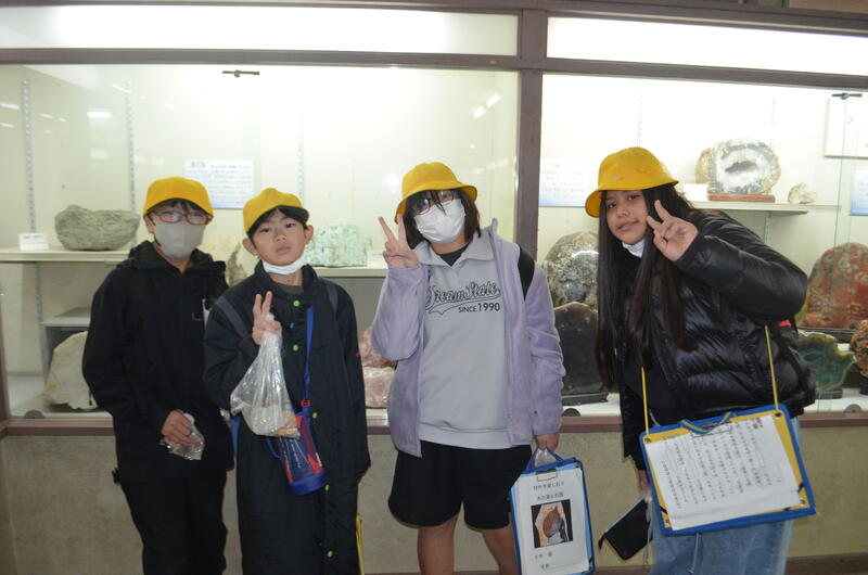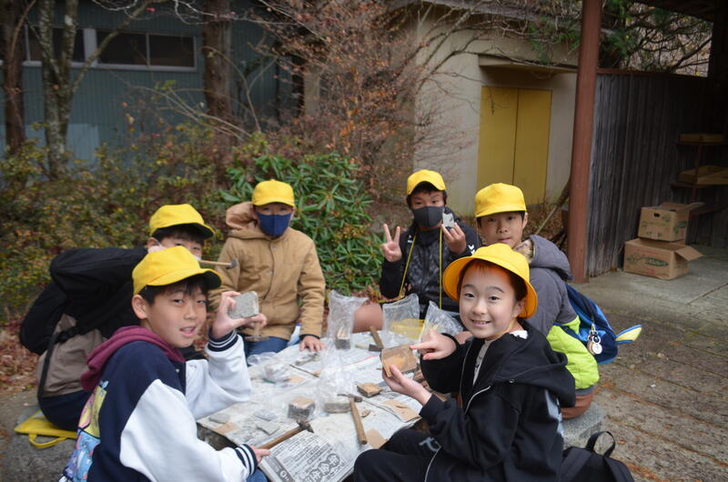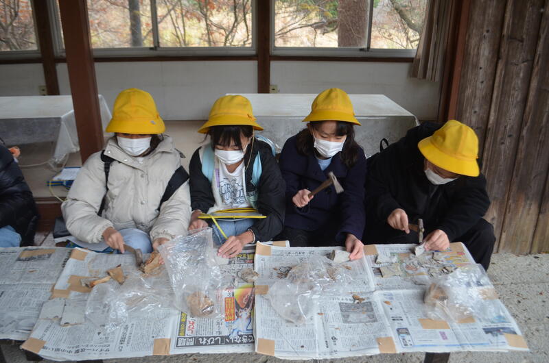 木の葉化石園では、展示された化石や鉱石を見たり、実際に石を割って化石を見付ける体験をしたりしました。
