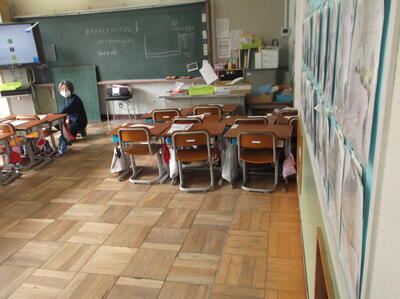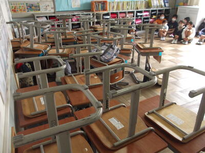 校内に不審者が侵入したことを想定し避難訓練を実施しました。児童は教室入口に机やいすでバリケードを作り、不審者の侵入を防ぐ方法を学びました。教師もさすまたを用い、不審者を子どもたちから遠ざける訓練を行いました。