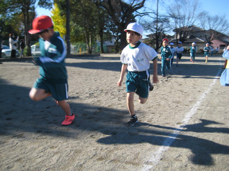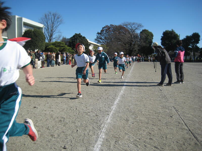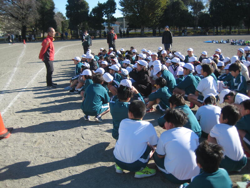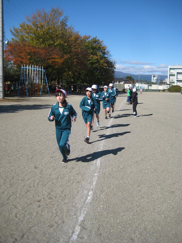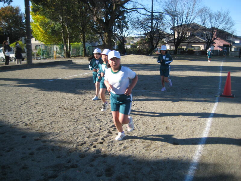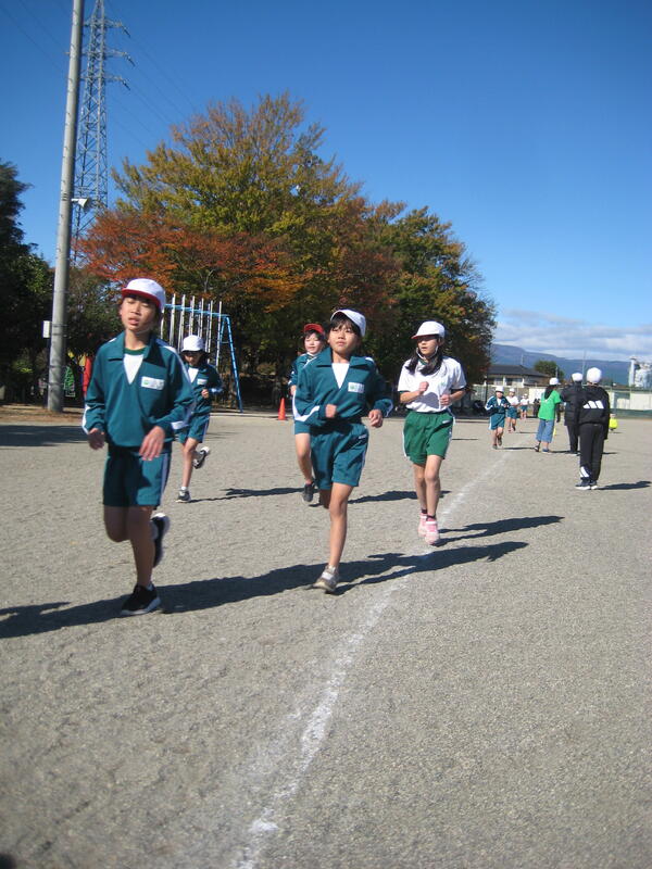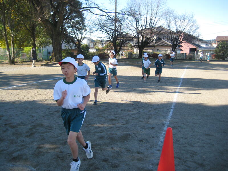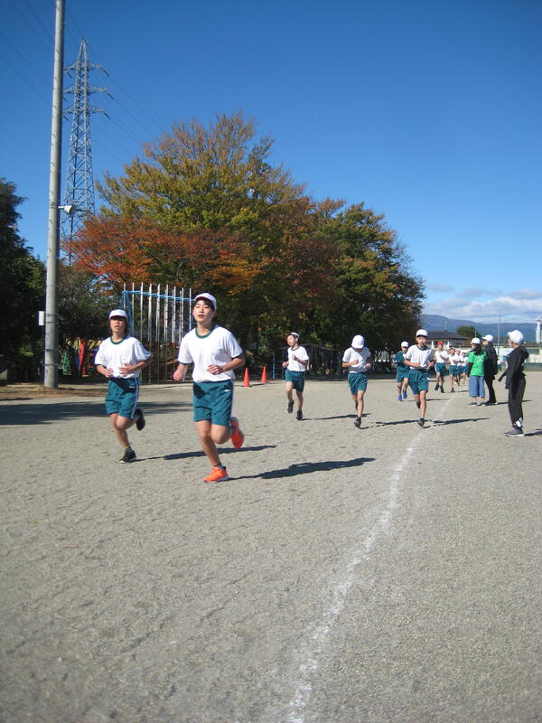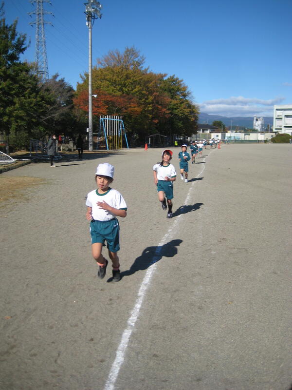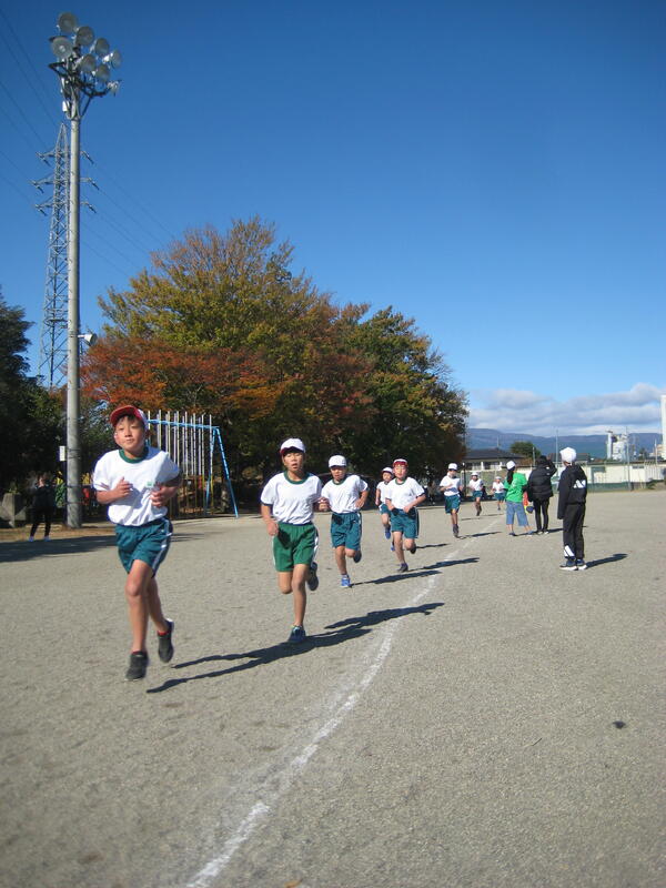 19日(火)、持久走大会を行いました。澄み切った青空の下、時折、強い北風の吹く中でしたが、児童は自己の記録に