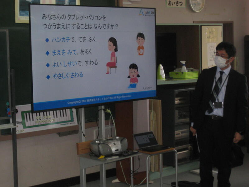 15日(月)、1年生児童が、正しいタブレット端末の使い方について学習しました。