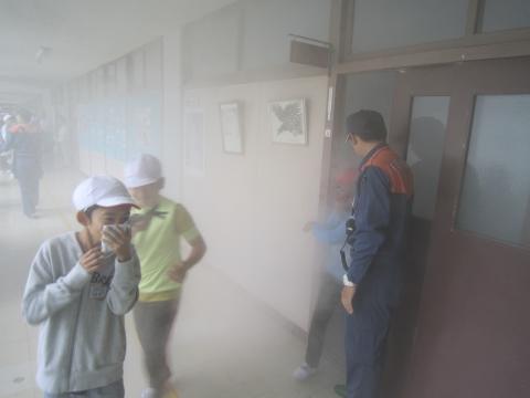 何人かで順番に煙(身体には無害なものです)で充満した図工室に入り、壁伝いに歩いて前の出口から出ます。中に入ると真っ白で何も見えません。児童たちも貴重な体験ができました。