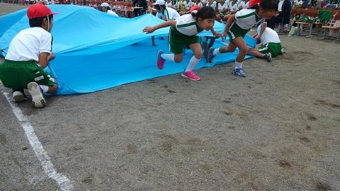 2年生障害走。ブルーシートを勢いよくくぐります。